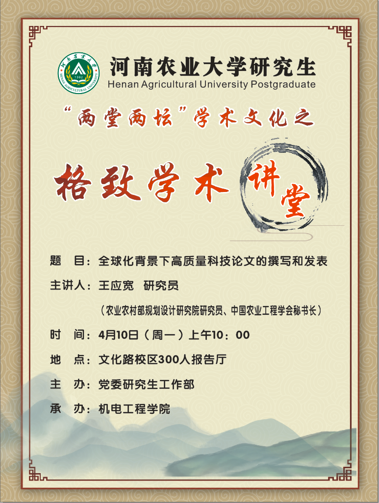 2023年4月10日(周一)上午10:00将在文化路校区300人报告厅举办格致学术讲堂“全球化背景下高质量科技论文的撰写和发表”报告会,欢迎研究生同学积极参与,希望对同学们的论文撰写有所启发。
