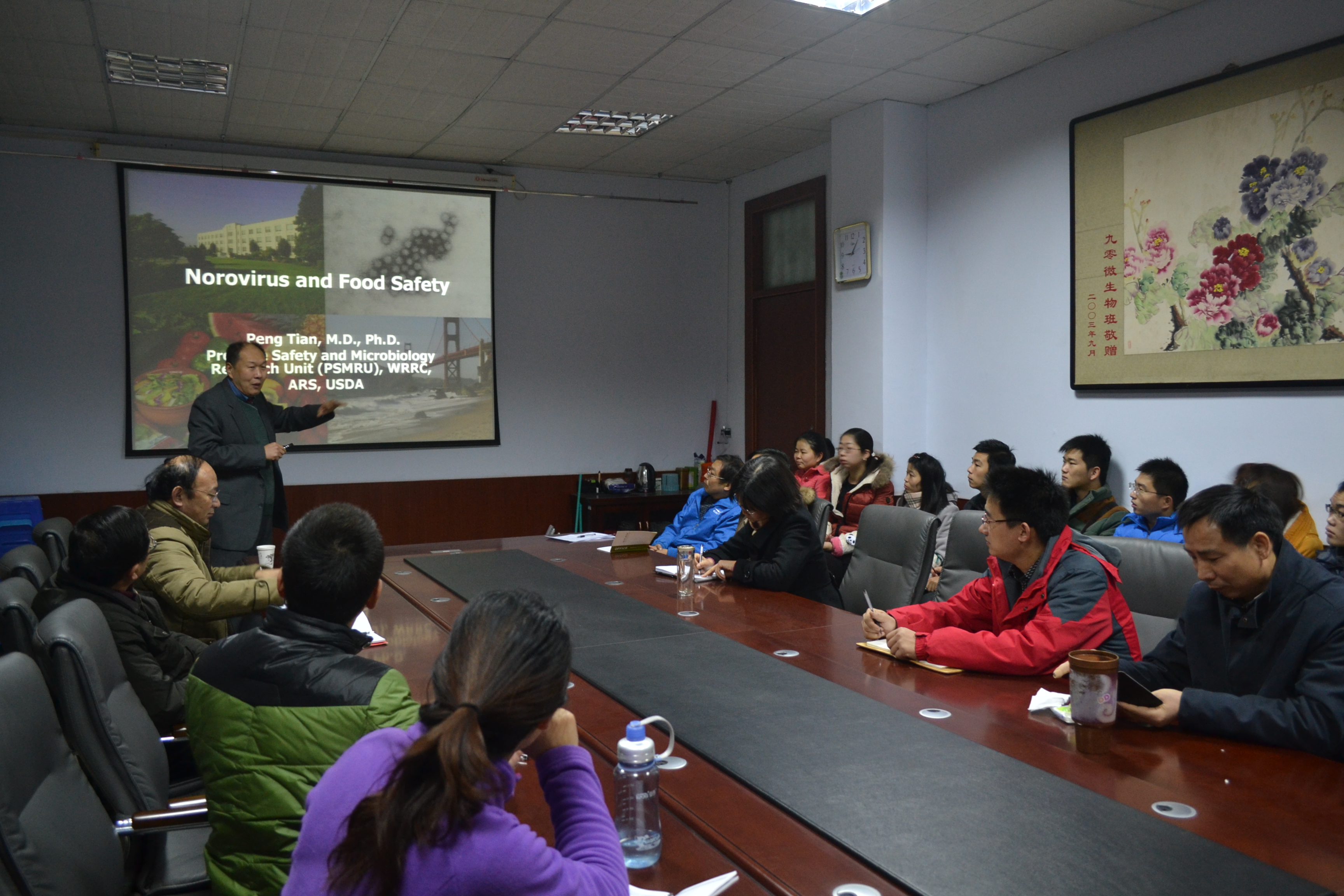 12月20日上午,美国农业部西部研究中心田鹏研究员应邀来到生命科学学院,在1号楼309报告厅为该院师生做了题为“Norovirus and Food Safety”的报告座谈会。座谈会由生命科学学院副院长郑文明教授主持。